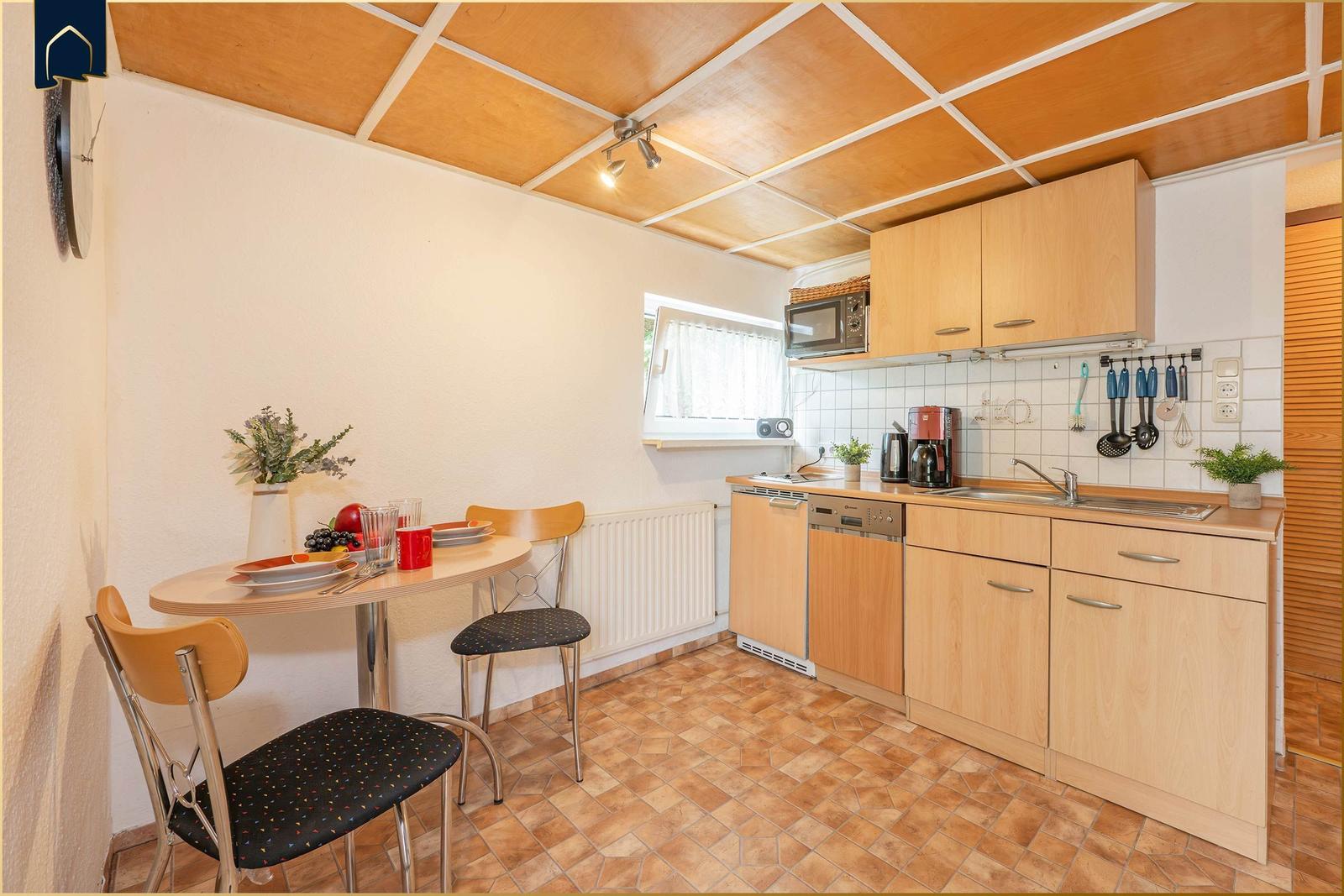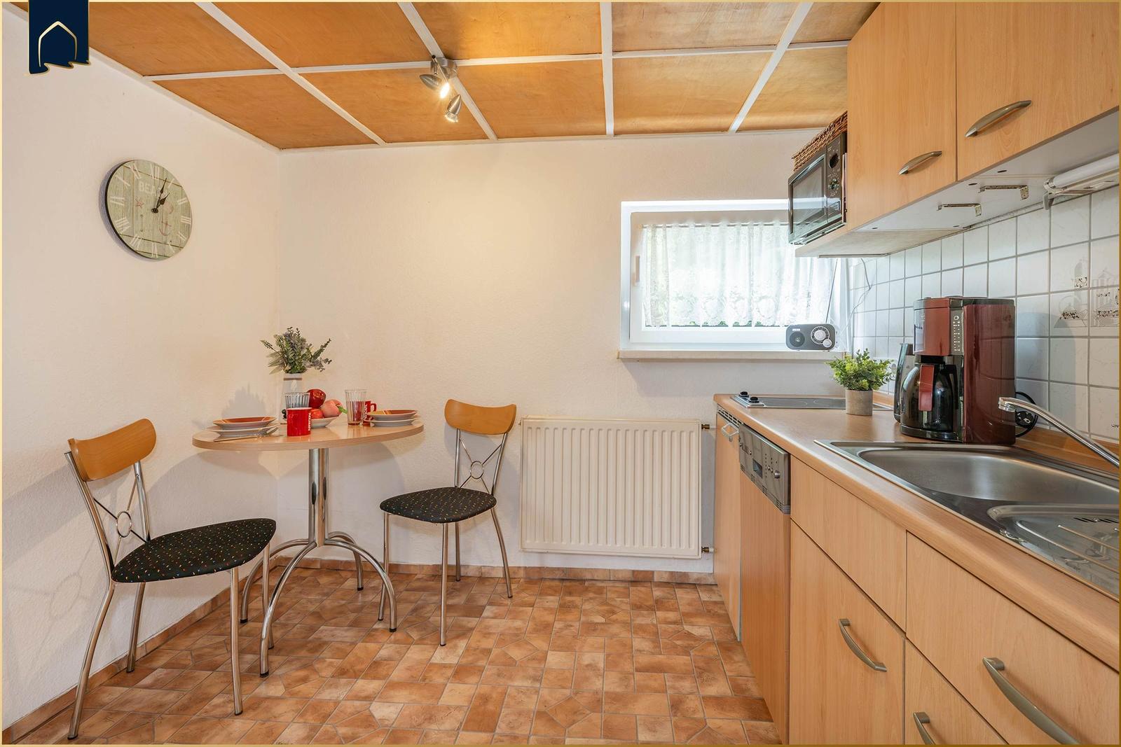 Eine separate Küche erfüllt alle Anforderungen an modernes Kochen: Sie ist mit einem Elektro-/Gasherd, einer Mikrowelle, einem Geschirrspüler, einem Kühlschrank mit Gefriermöglichkeit und einer Kaffeemaschine ausgestattet. Geschirr, Besteck und Küchengeräte wie Toaster und Eierkocher sind ebenfalls vorhanden.