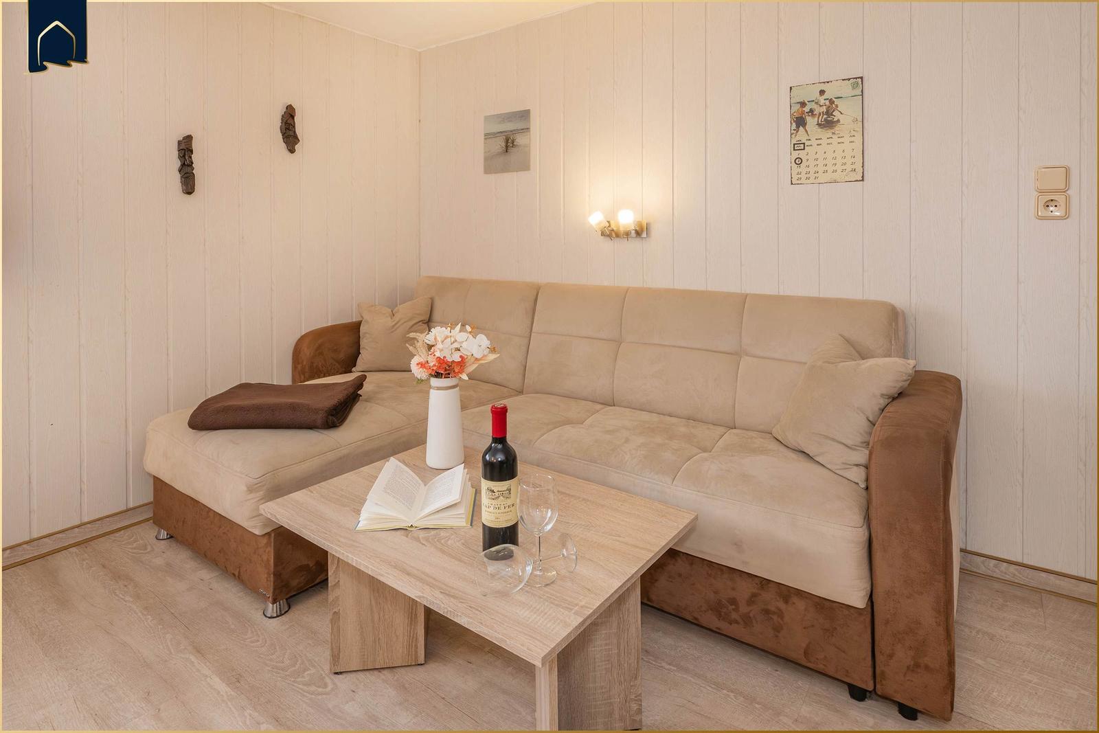 Im Wohnbereich laden ein Sofa und Sessel zum Entspannen ein, während die HiFi-Anlage und der TV für Unterhaltung sorgen. WLAN-Internet sorgt für eine Verbindung zur digitalen Welt, und Allergikerfreundlichkeit ist gegeben. Für zusätzlichen Komfort bieten ein Parkplatz, Wasserkessel, Geschirrtücher sowie ein Wäscheständer praktische Annehmlichkeiten. Fliegengitter und ein Sonnenschirm runden das Angebot ab.
