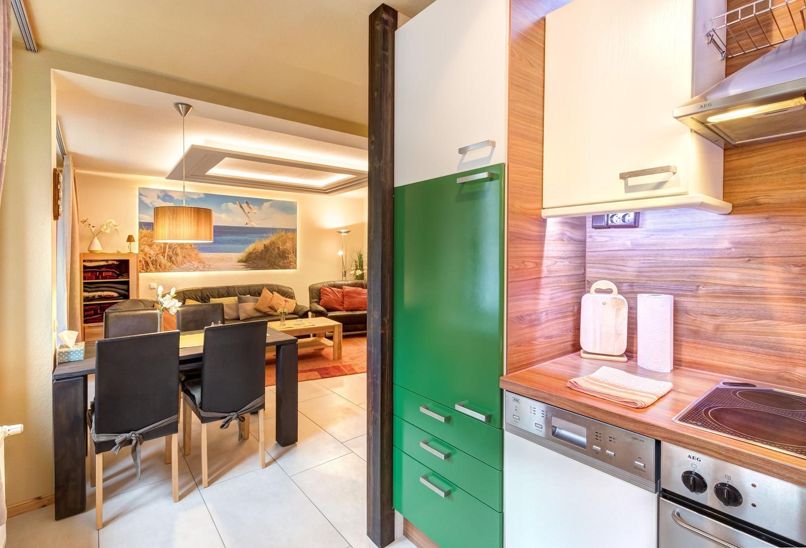 In dieser charmanten Ferienwohnung erwartet den Gast eine stilvolle und allergikerfreundliche Unterkunft. Die offene Küche ist mit modernen Geräten ausgestattet, darunter ein Elektro-/Gasherd, Backofen, Geschirrspüler und Kühlschrank, sowie eine Kaffeemaschine und Toaster für den perfekten Start in den Tag. Ein Esstisch lädt zu gemeinsamen Mahlzeiten ein. Der Wohnbereich bietet ein bequemes Sofa, einen TV und eine HiFi-Anlage für entspannte Abende.
