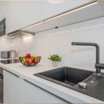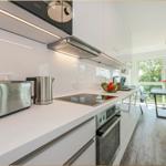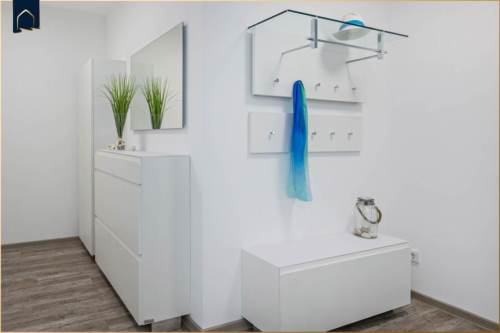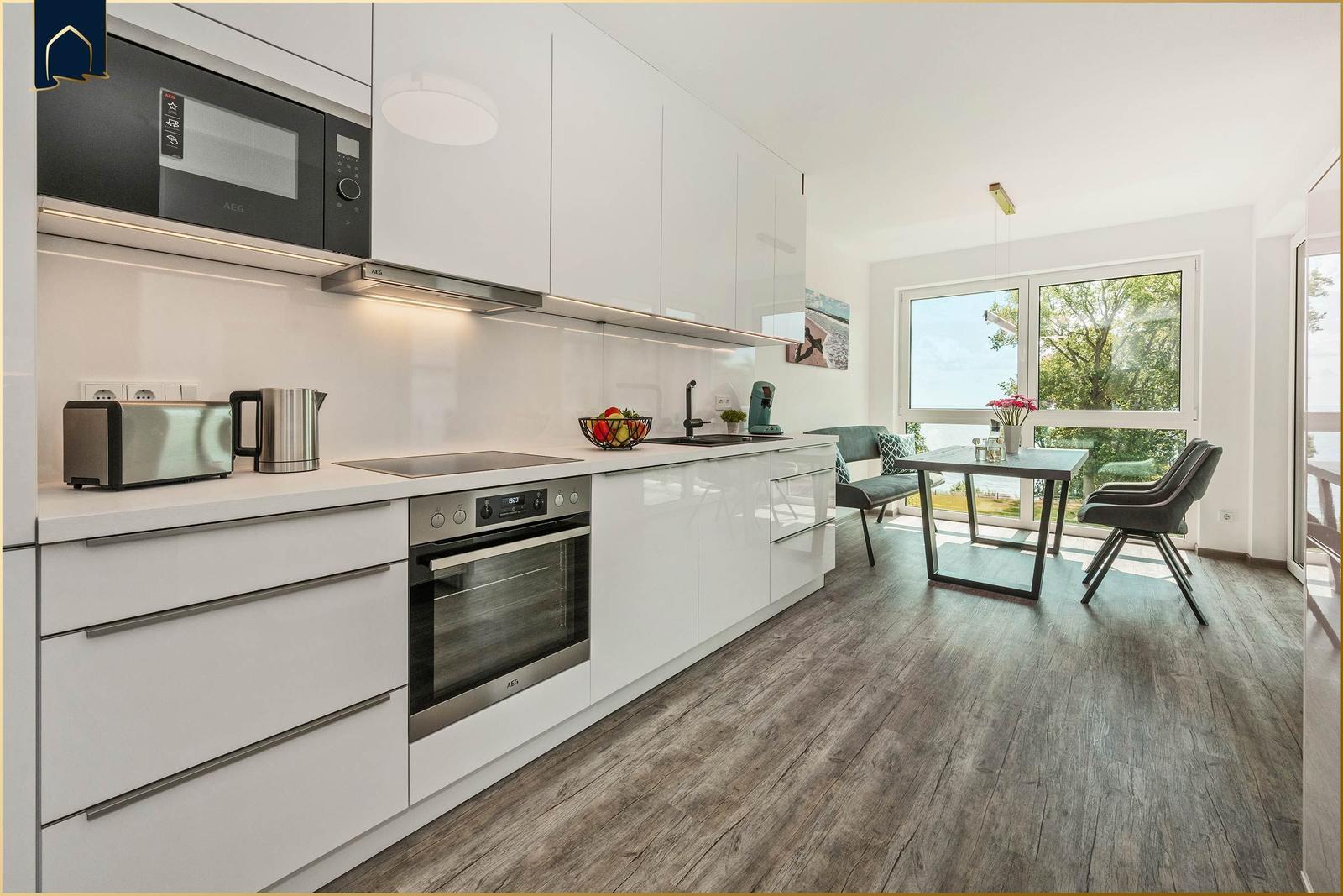 Die offene Küche ist vollständig ausgestattet, einschließlich Geschirrspüler, Elektro-/Gasherd, Backofen, Mikrowelle und Kühlschrank, damit kulinarischen Köstlichkeiten nichts im Wege steht. Eine praktische Waschmaschine und ein Parkplatz sind ebenfalls vorhanden.