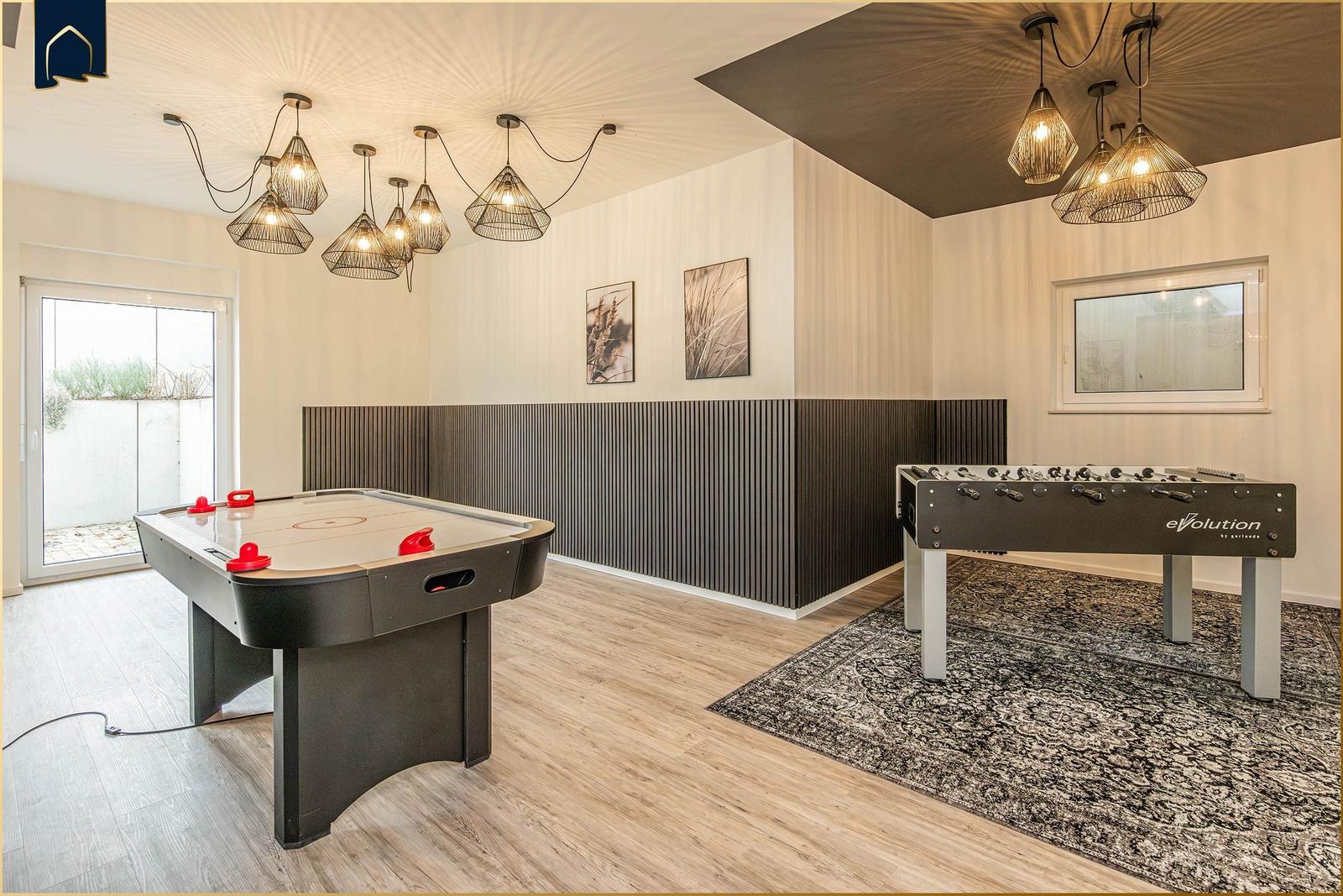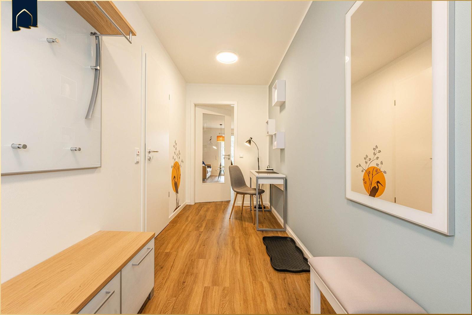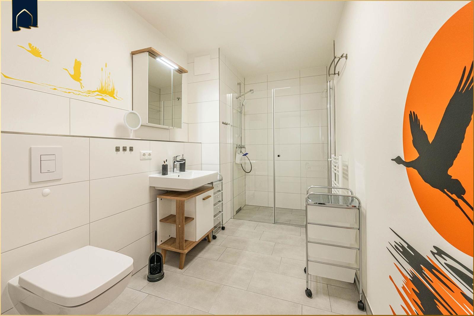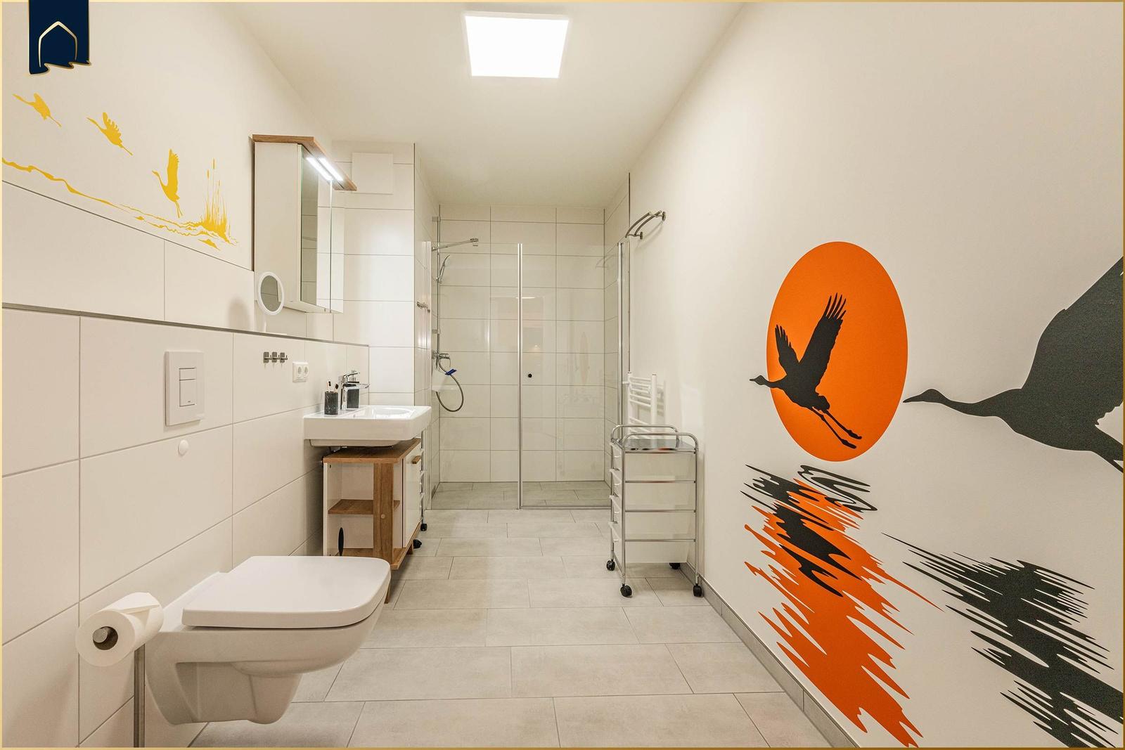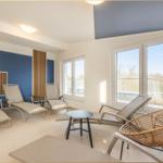 Die Ferienwohnung "Der Kranich" in Zirchow auf Usedom bietet einen hochwertigen Außenbereich, der die Erholung der Gäste unterstützt. Ein eigener Balkon lädt dazu ein, die frische Luft und die Ruhe der Umgebung zu genießen. Zudem stehen den Gästen interessante Gemeinschaftsbereiche zur Verfügung: Ein stilvoll gestalteter Sauna- und Ruhebereich im Dachgeschoss sorgt für Entspannung, während ein gemeinschaftlich nutzbarer Fitness- und Freizeitraum im Keller Aktivität und Spielspaß ermöglicht – ausgestattet mit Kicker, Darts und weiteren Freizeitmöglichkeiten. Die ruhige Lage in Zirchow, umgeben von Natur, ergänzt das Angebot. Die Kombination aus privatem und gemeinschaftlichem Außenbereich macht die Ferienwohnung "Der Kranich" zu einem idealen Rückzugsort für jeden, der eine entspannte Zeit auf der Ostseeinsel Usedom verbringen möchte.