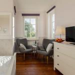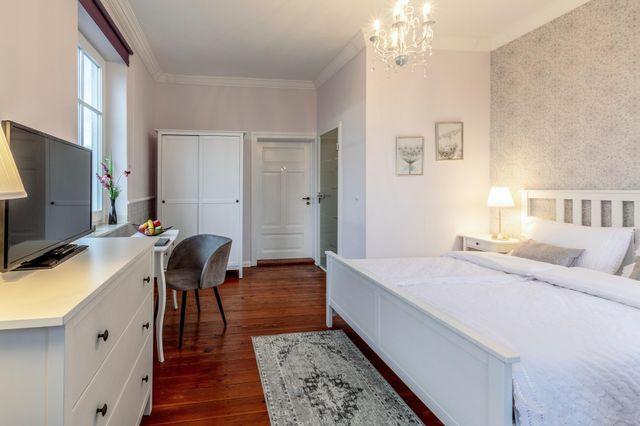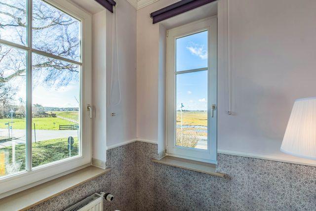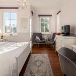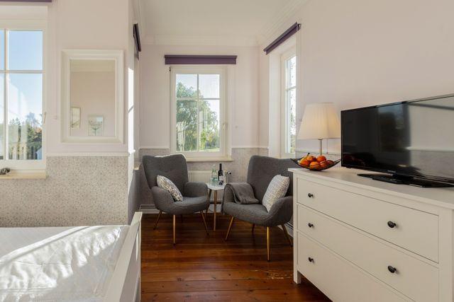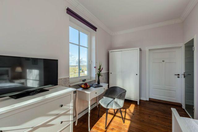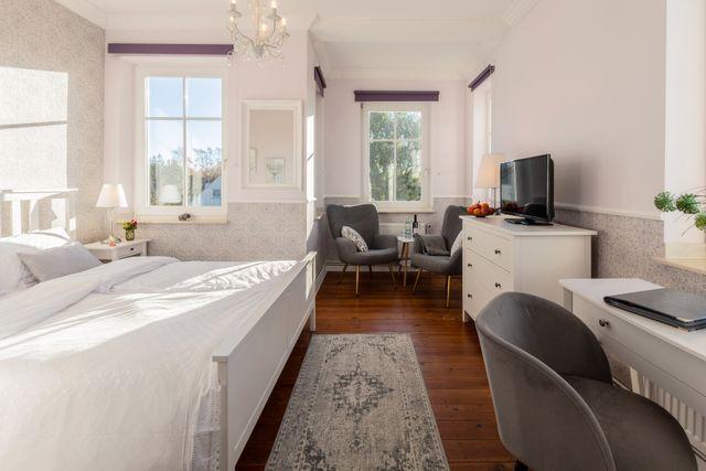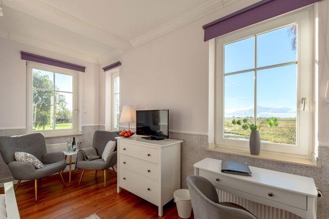 Willkommen in Doppelzimmer 5 ein lichtdurchfluteter Rückzugsort voller Charme (ca. 19,8 m²), liebevoll gestaltet für unvergessliche Tage zu zweit oder ganz für sich allein. Lassen Sie den Blick schweifen über die glitzernde Ostsee am Horizont, den kleinen Hafen von Thiessow, den weiten Greifswalder Bodden bis hin zu den sanften Hügeln der Zicker Berge. Im behaglichen Erker mit drei Fenstern und zwei gemütlichen Ohrensesseln dürfen Sie einfach loslassen, träumen und die Farben des Sonnenuntergangs auf sich wirken lassen.