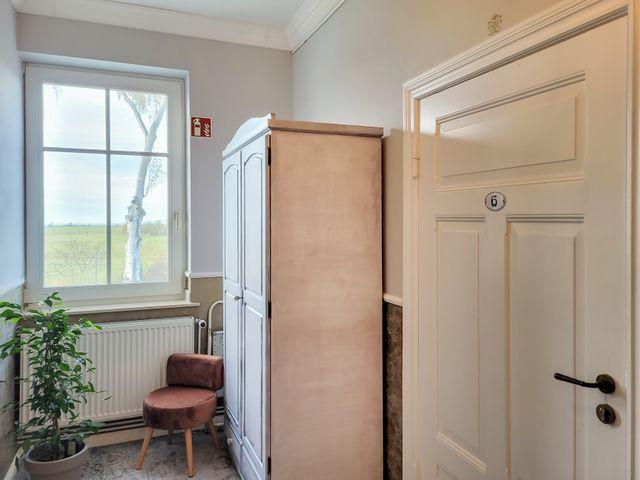 Willkommen im frisch renovierten Doppelzimmer 6 im 1. Obergeschoss ein heller Wohlfühlort (ca. 19,5 m²) für 12 Personen. Genießen Sie den weiten Panoramablick: Am Horizont die Ostsee, darunter der malerische Hafen von Thiessow, der Greifswalder Bodden und die sanft geschwungenen Zicker Berge ein Ausblick, der zum Innehalten einlädt.